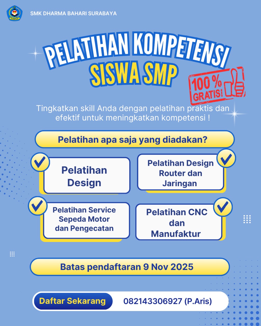 Ayo rekkk segera mendaftar Pelatihan kompetensi di SMK Dharma Bahari Surabaya, Gratis tanpa di pungut biaya!!